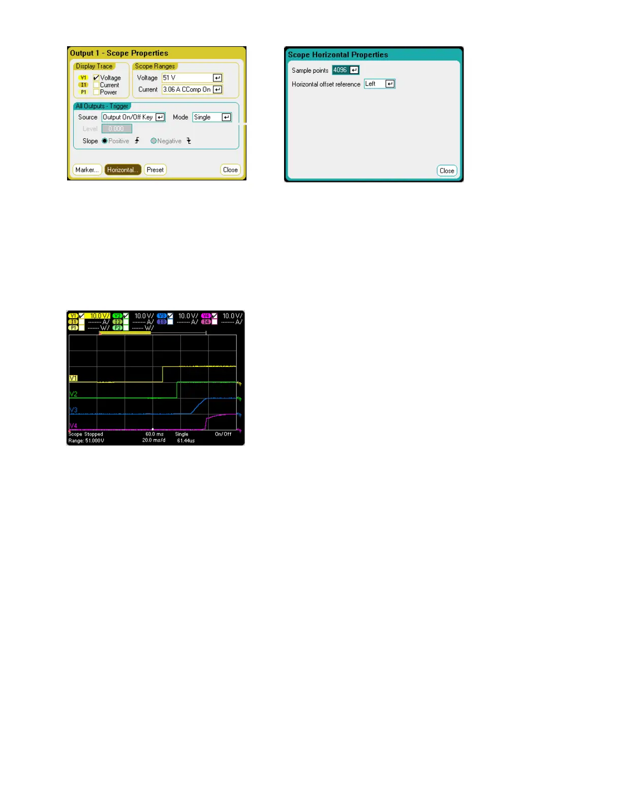 l Press the All Outputs On key to start the output sequence and trigger the scope.