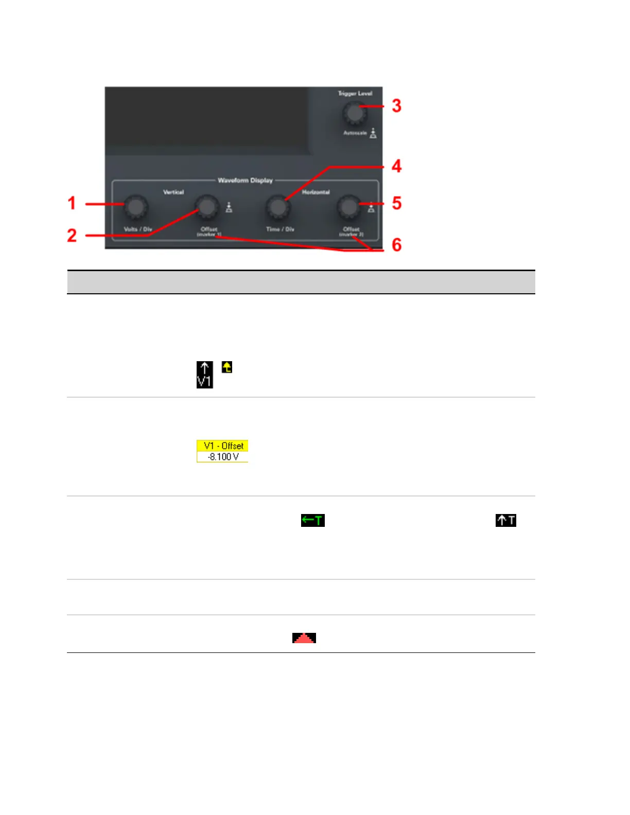 5 Horizontal Offset Moves the waveform to the right or leftof the horizontal offsetreference. The trigger point is