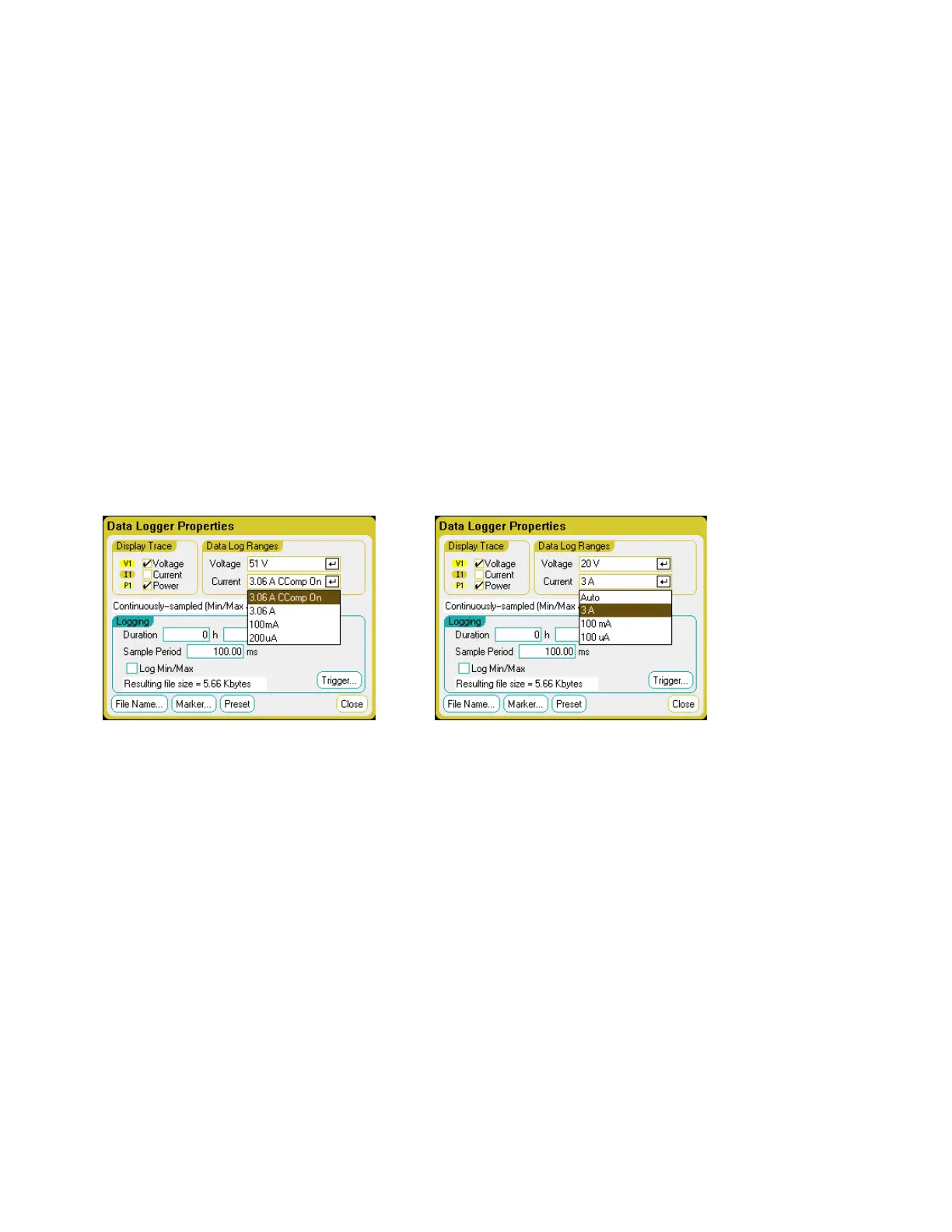 In the Data Log Ranges area, select the desired lower measurement range from the Voltage or