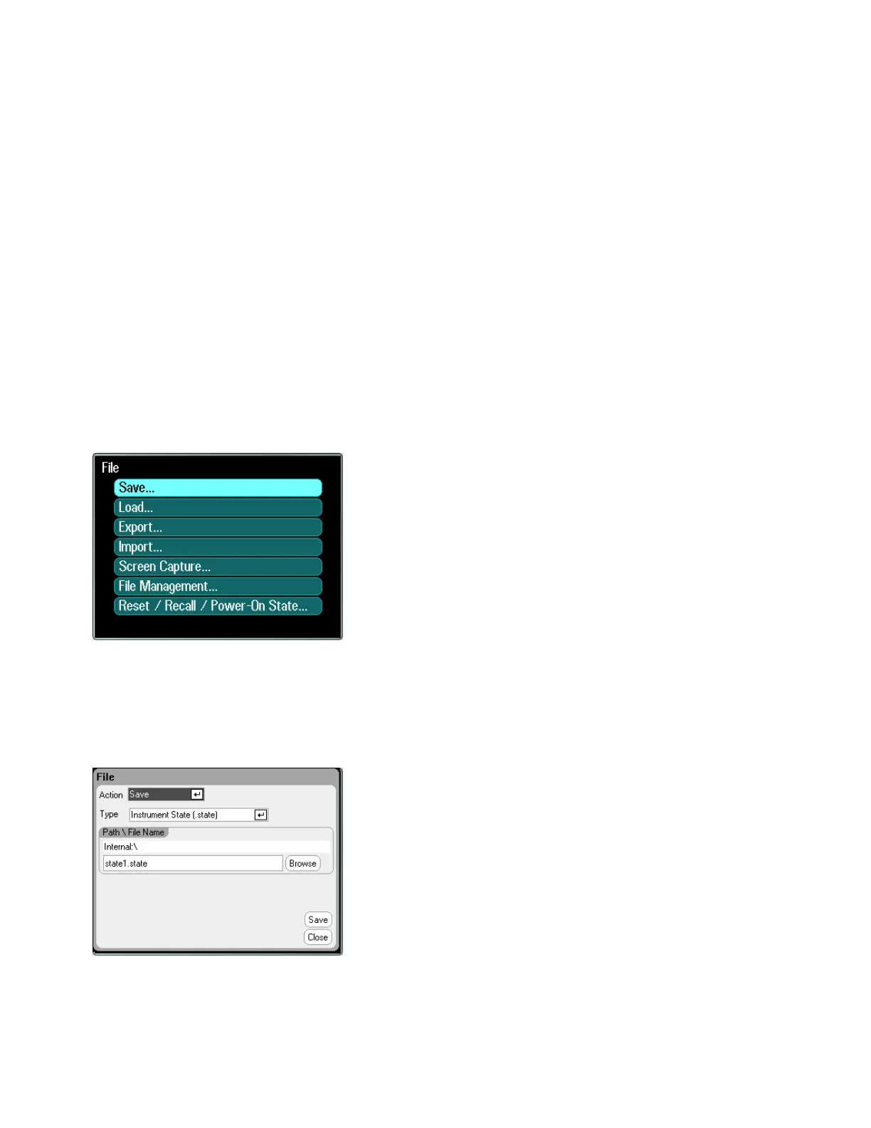 To save the instrument state, scope data, or an Arb sequence, press the File key, then scroll to and