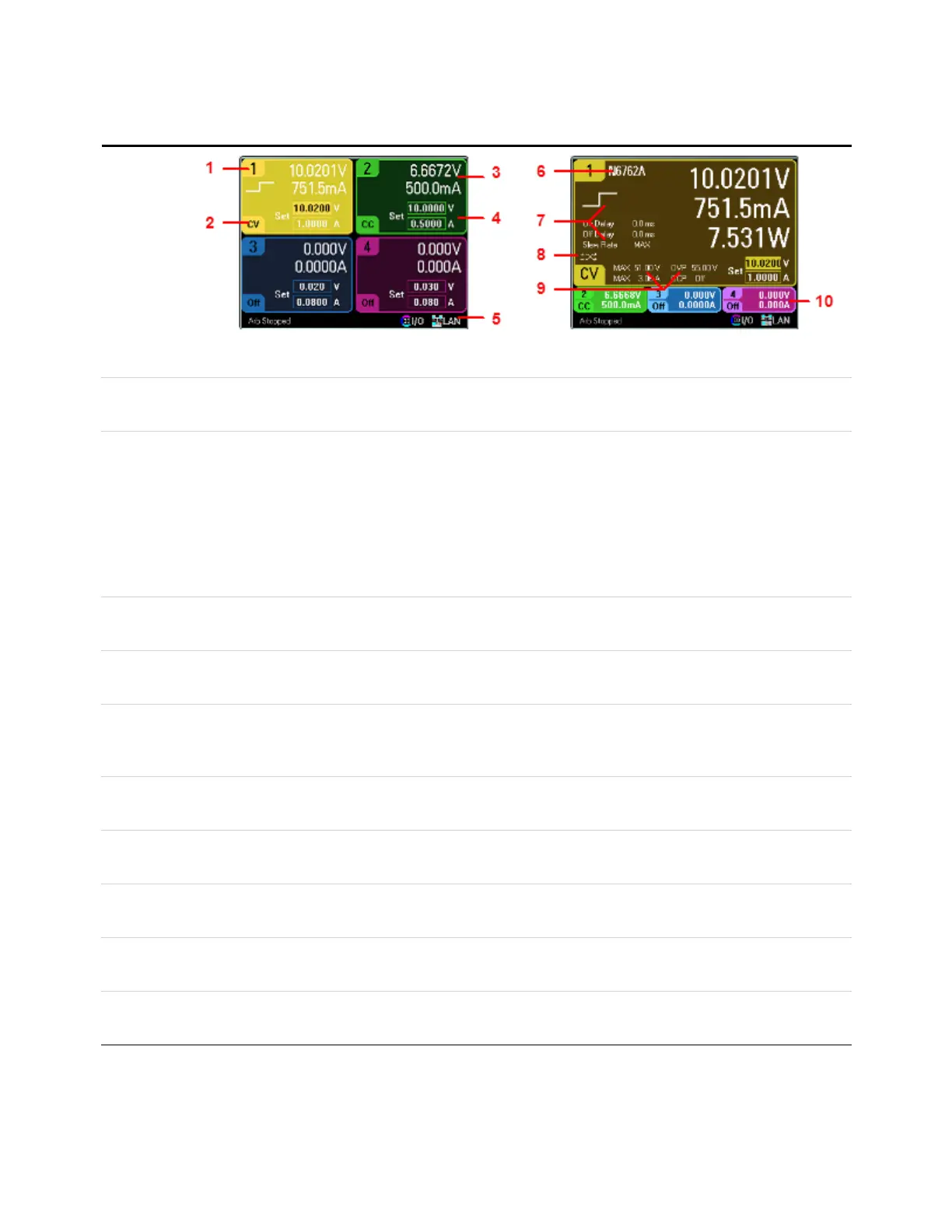 Displays the actual voltage, current, and status of the other outputs.