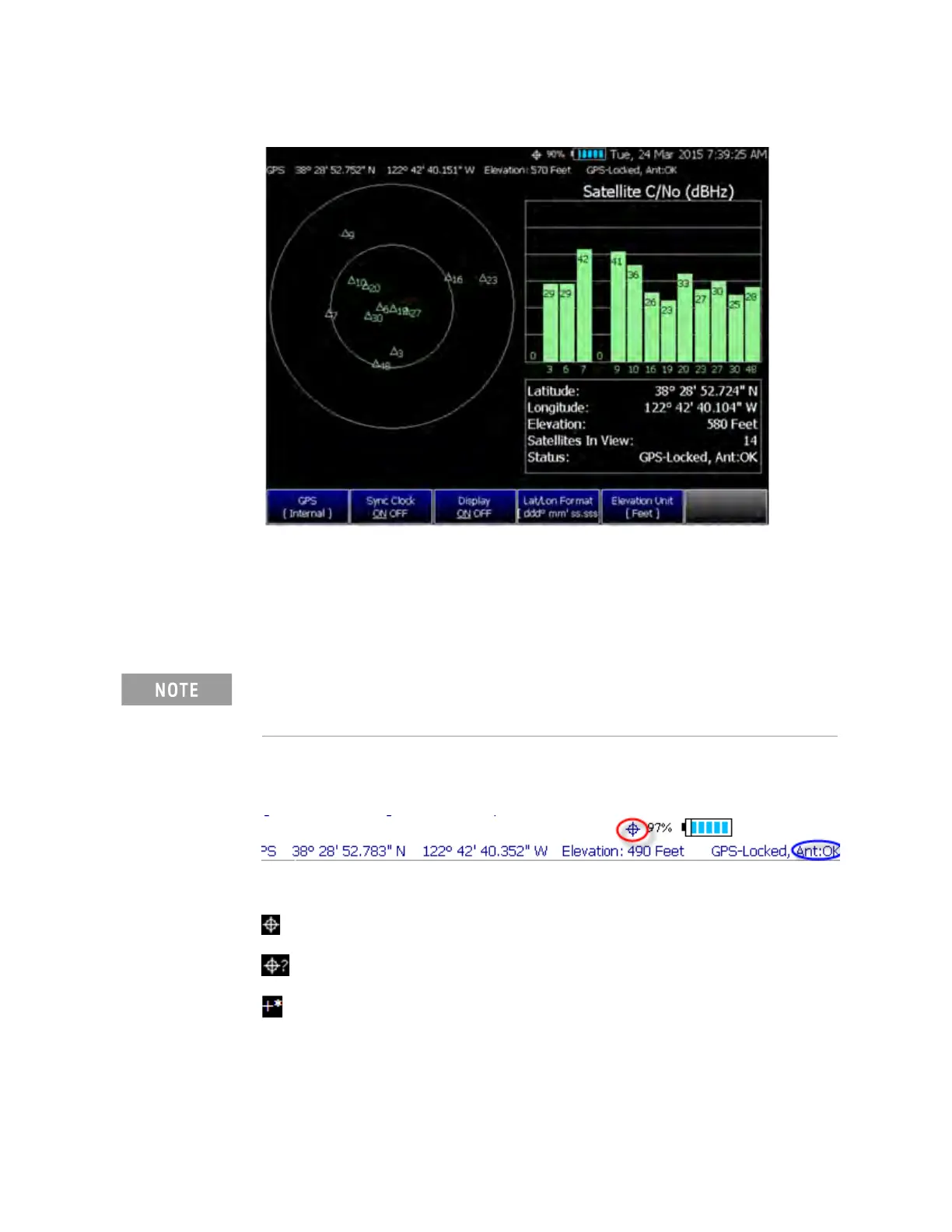 The following icons (located in RED circle above) indicate the GPS lock status: