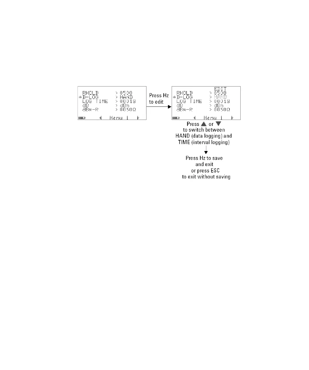 1 Set to “HAND” to enable manual (hand) data logging, or set to “TIME” to