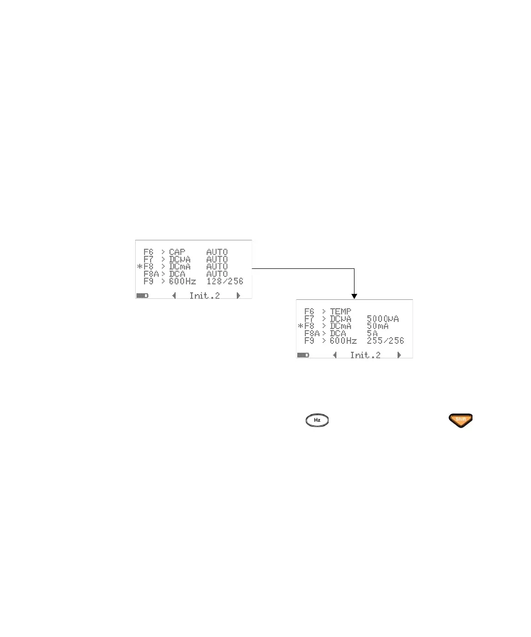 – The F8 default measurement range for DC mA is changed from Auto to 50 mA;