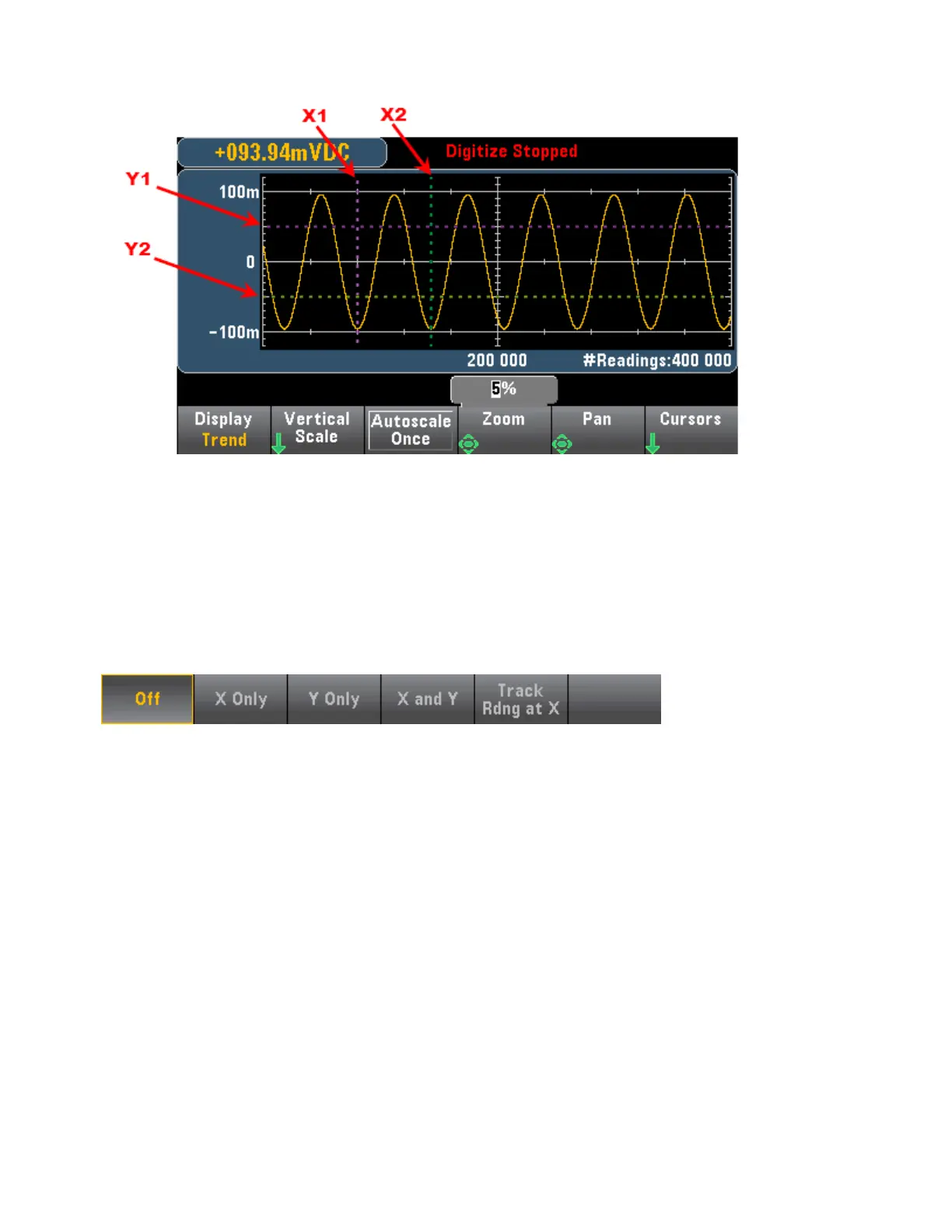X and Y – Displays the X1, X2, Y1 and Y2 cursors. In this mode, these softkeys are available: