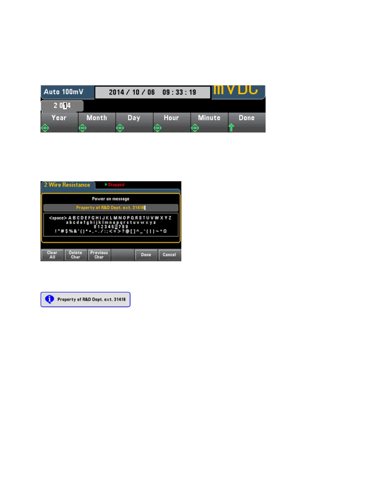 Power on Message sets a message that is displayed when the instrument powers up and when you press
