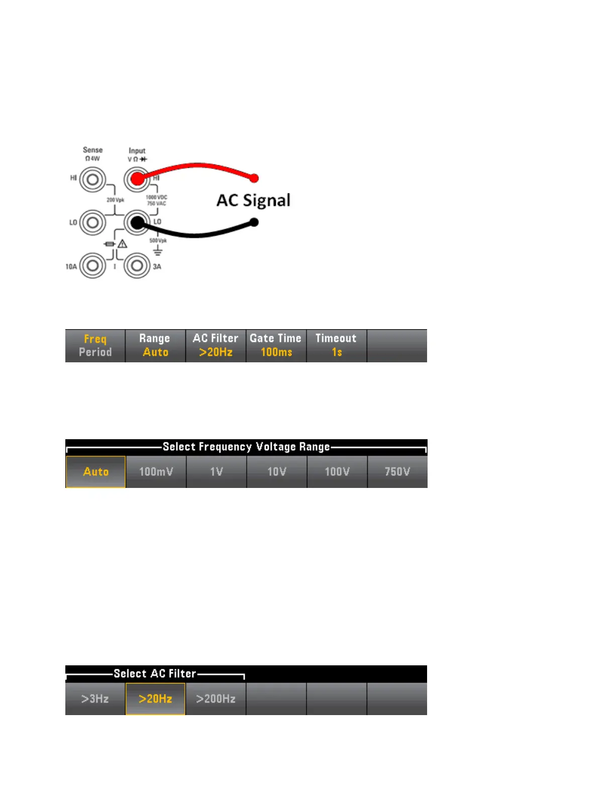 Step 4: Press AC Filter and choose the filter for the measurement. The instrument uses three different AC