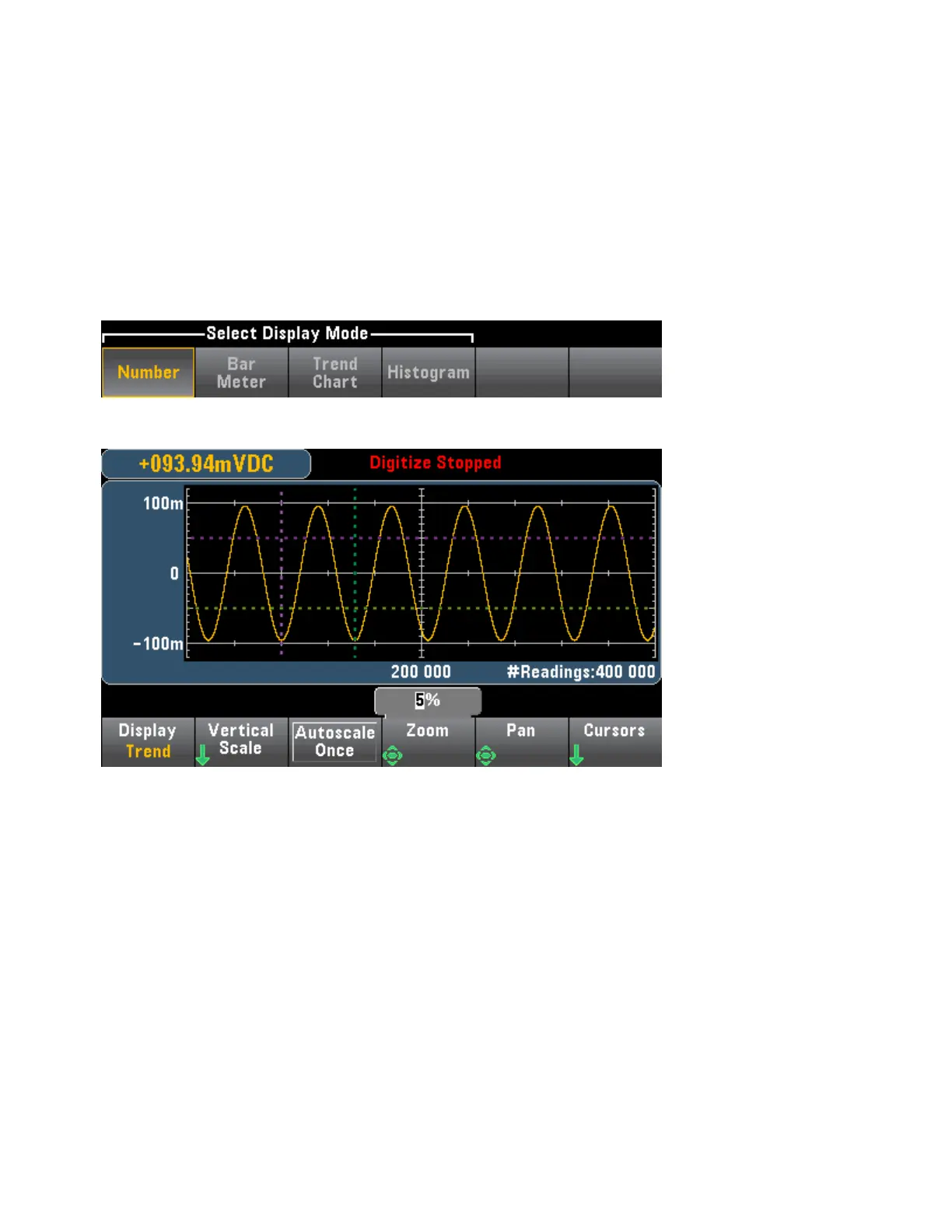 When the 34465A/70A DMM is in digitize mode (DIG option required), Zoom, Pan, and Cursor trend chart