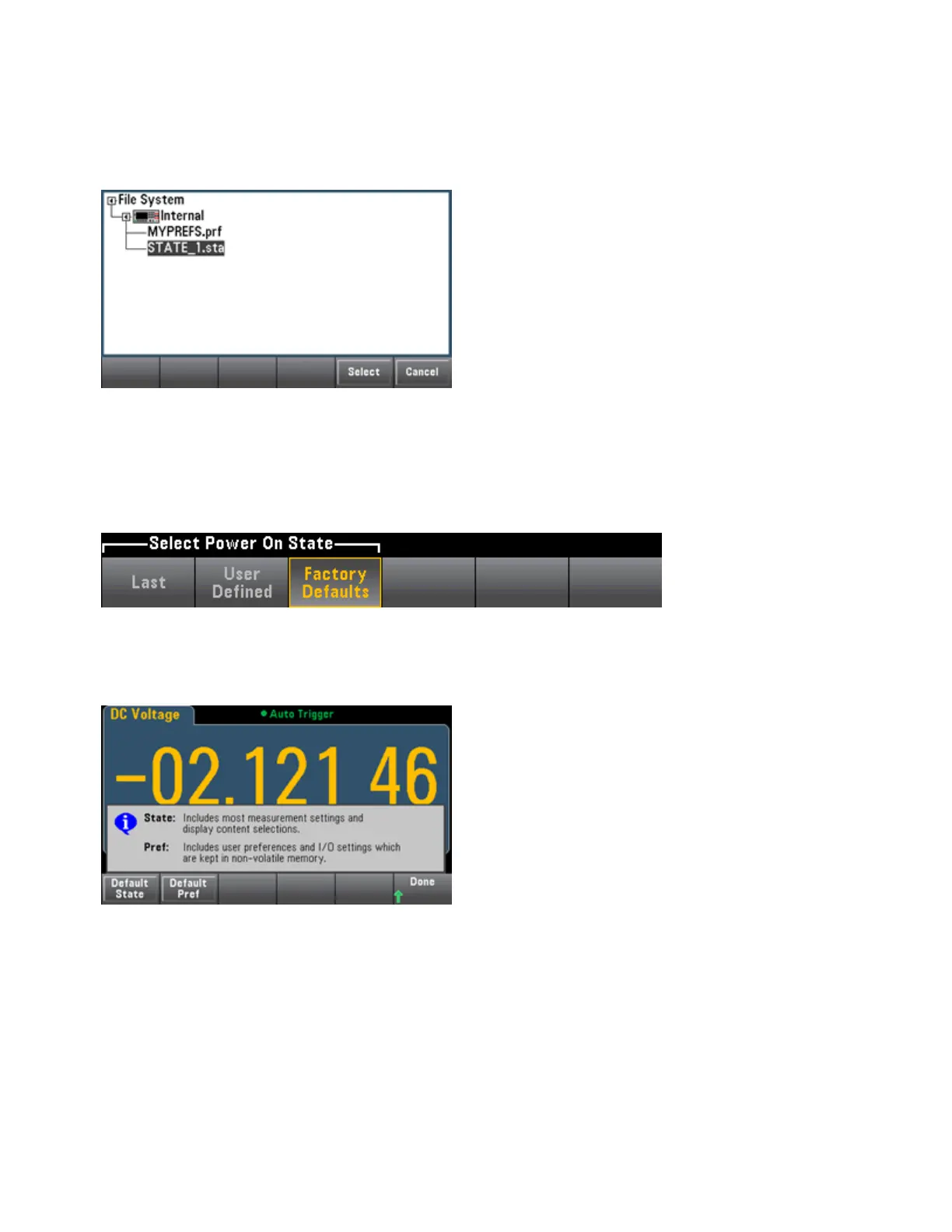 was powered down with the power switch (Last), a user-selected state file (User Defined), or the factory