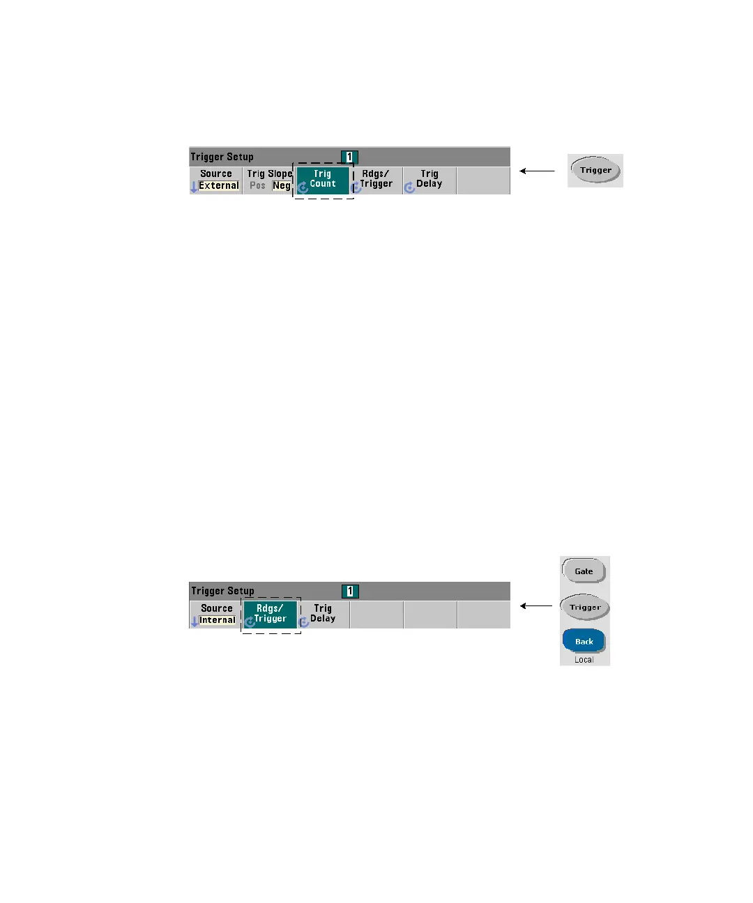 The trigger count range is 1 to 1,000,000. CONFigure and MEASure set a default
