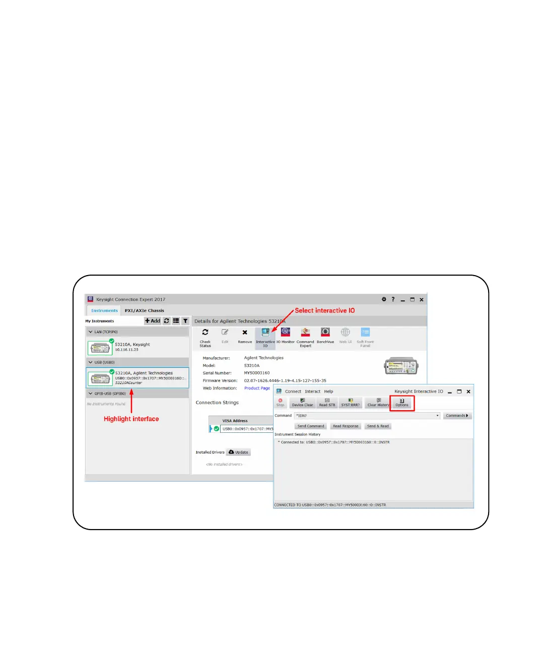 of sending commands to the 53210A. Interactive IO is accessible from any of the