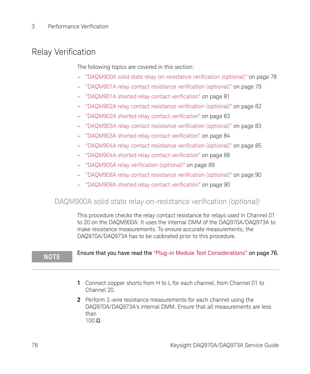 – “DAQM901A relay contact resistance verification (optional)” on page 79