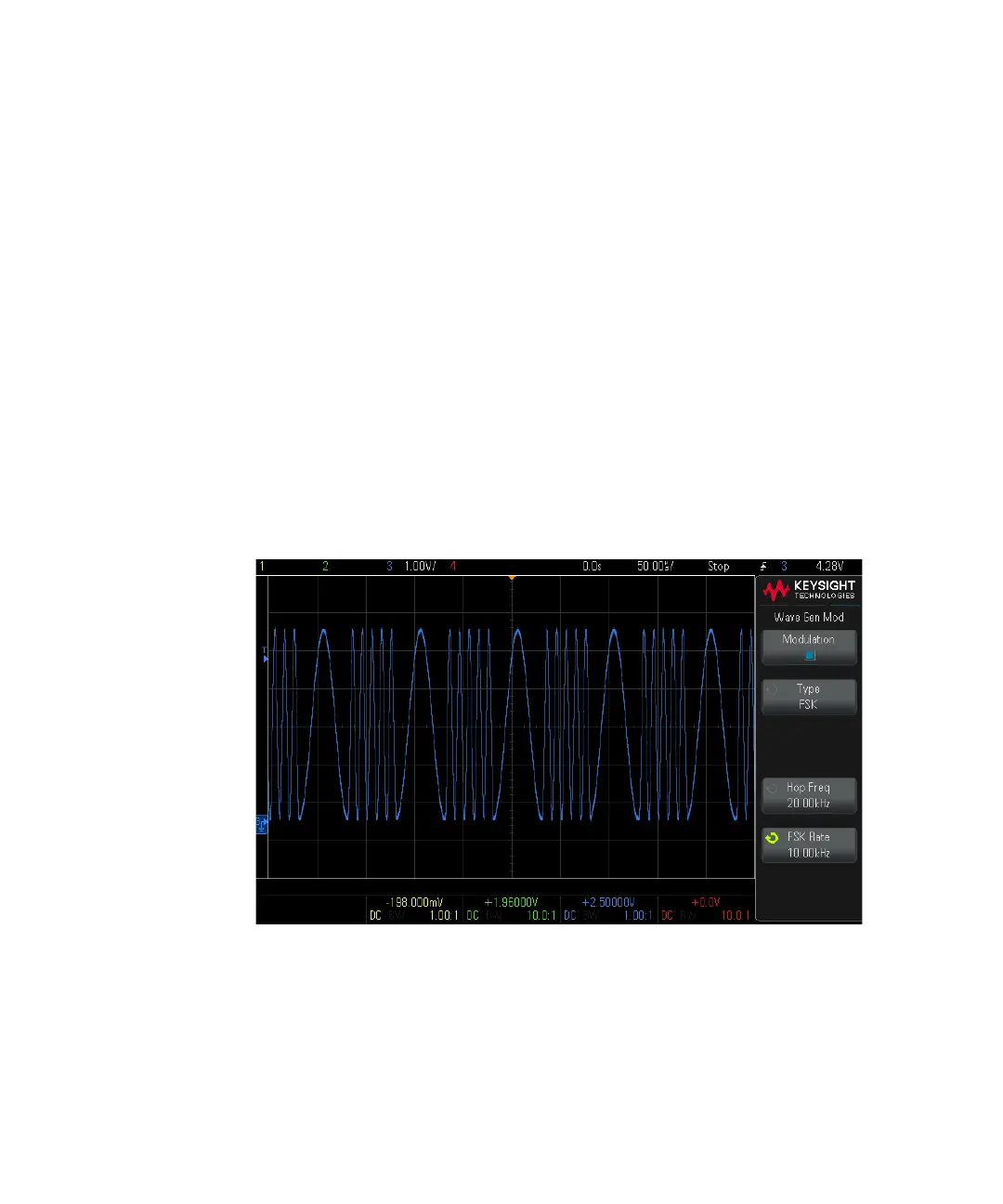 The following screen shows an FSK modulation of a 100 kHz sine wave carrier