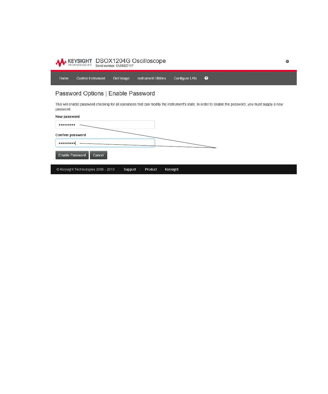 • Another way to disable the password is to reset the oscilloscope's LAN settings.