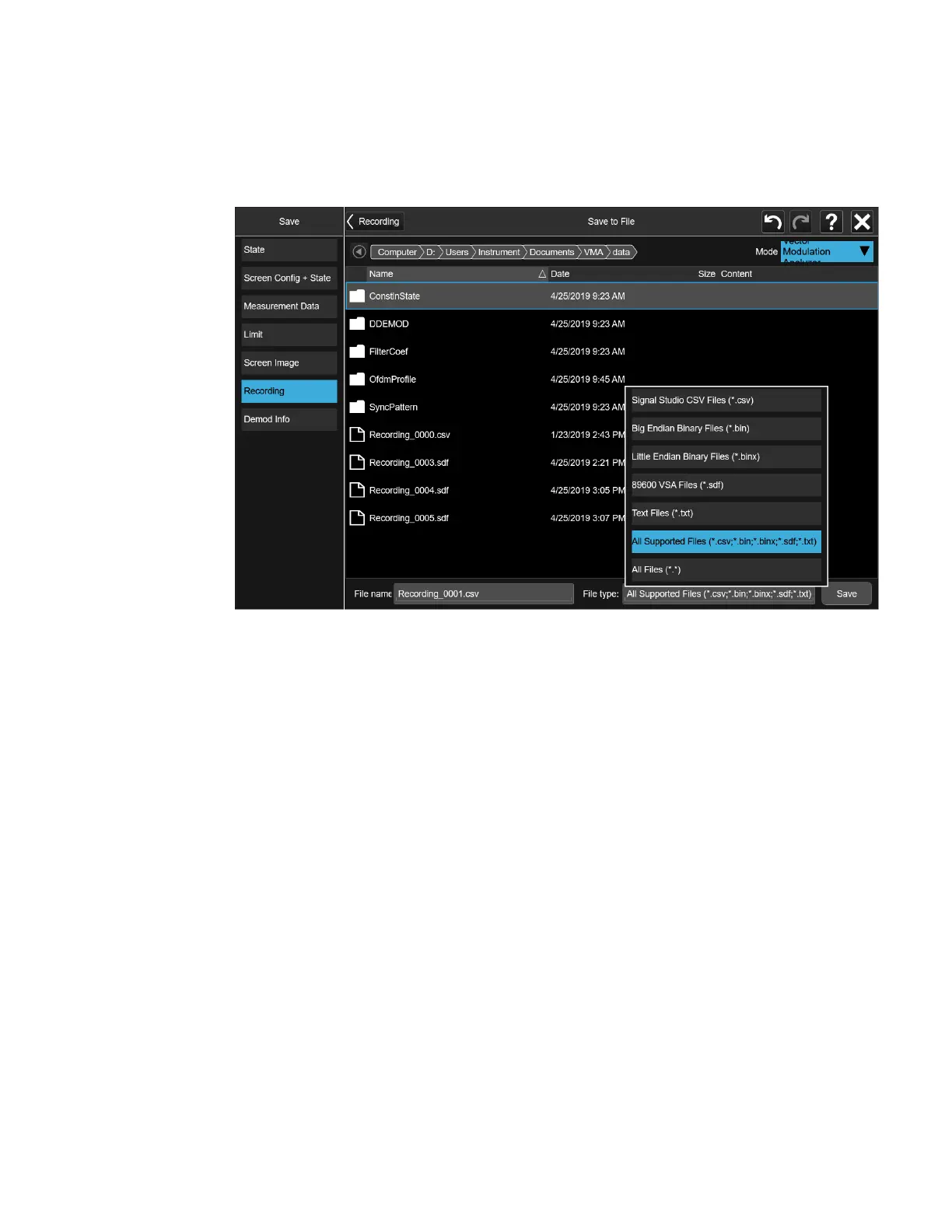 SDF, TXT, BIN, BINX). You can find details of the file formats in Save > Recording.