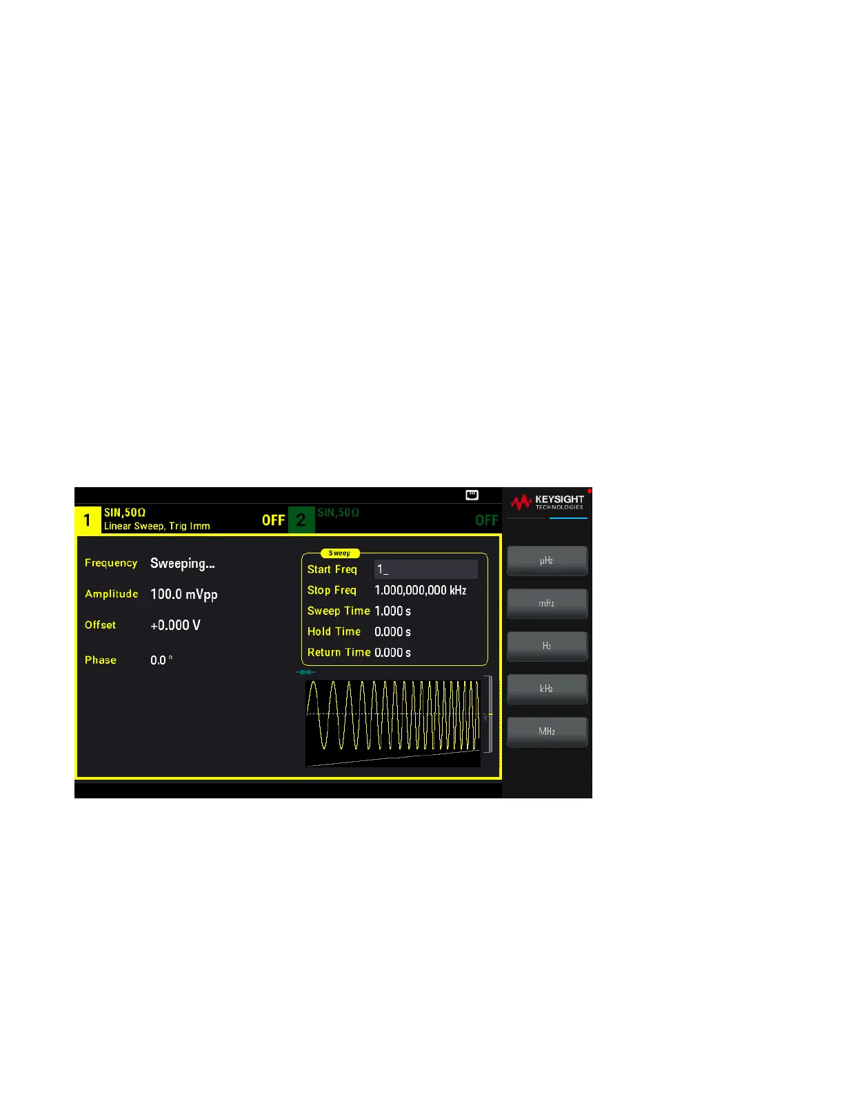 – Start and Stop frequencies: 1 μHz to maximum frequency for the waveform. The sweep is phase continuous over