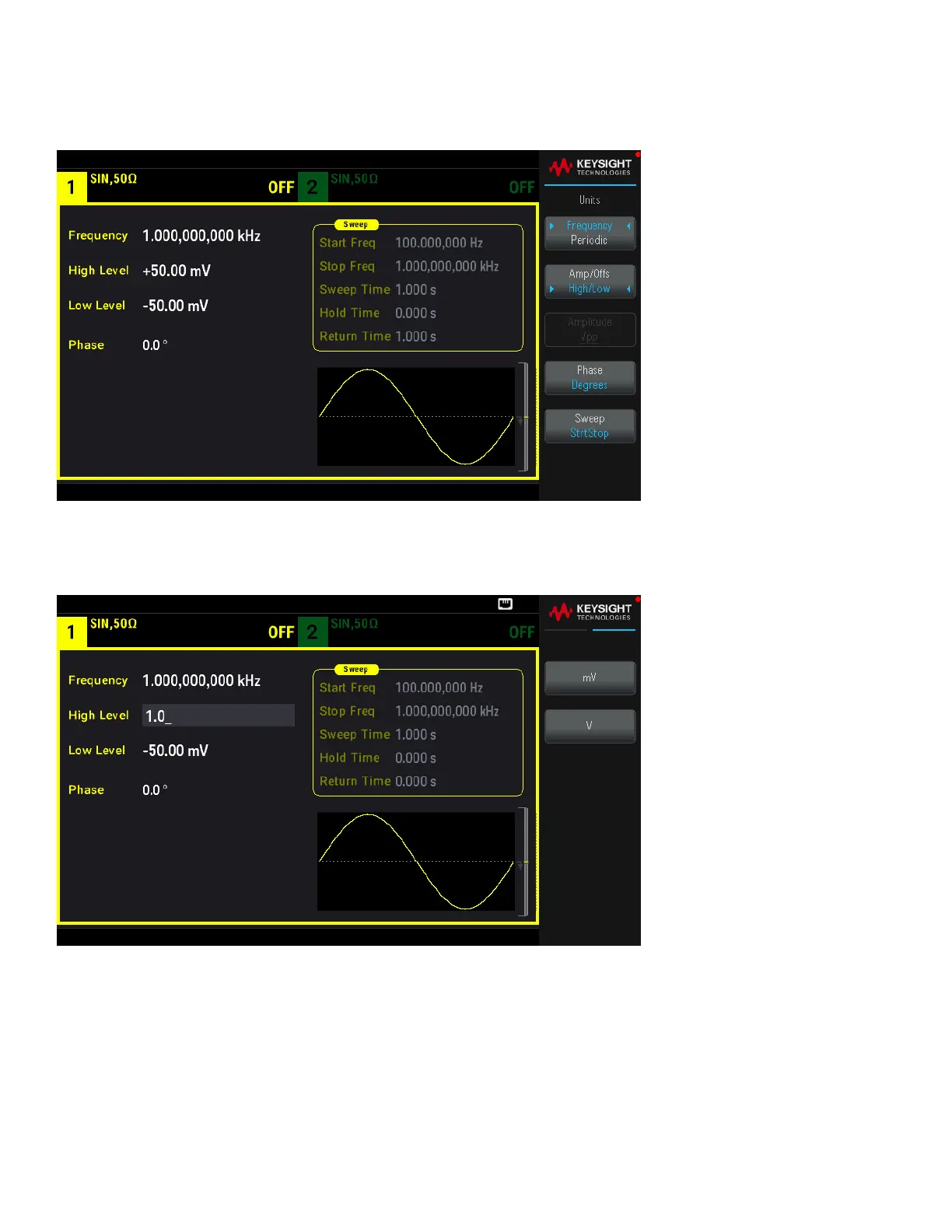 1. Presione [Units] > Ampl/Offs High/Low. ([Unidades] > Ampl/Comp Alto/Bajo). Cambie a High/Low (Alto/Bajo) como