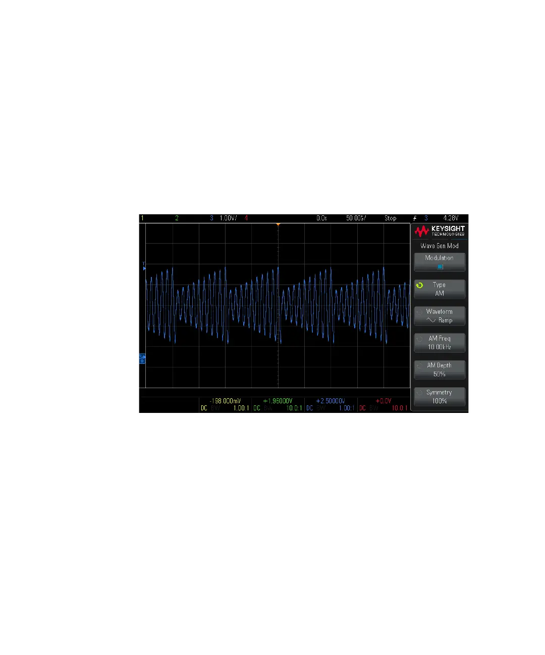 The following screen shows an AM modulation of a 100 kHz sine wave carrier