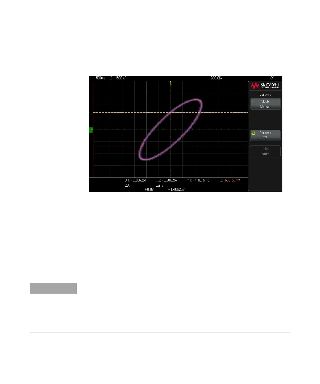 6 Move the Y1 and Y2 cursors to the intersection of the signal and the Y axis.