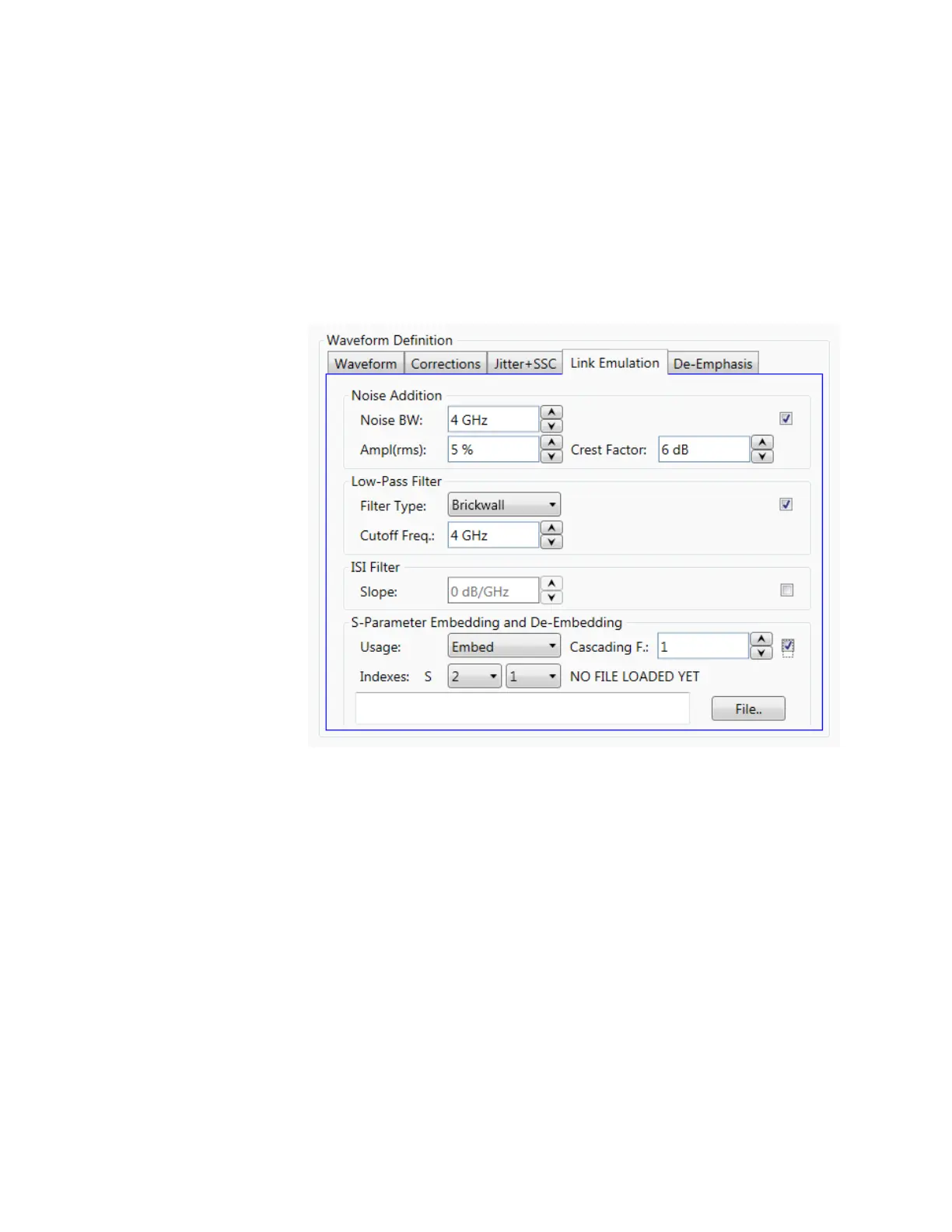 In this tab, linear distortions and noise can be added to the waveforms to emulate the