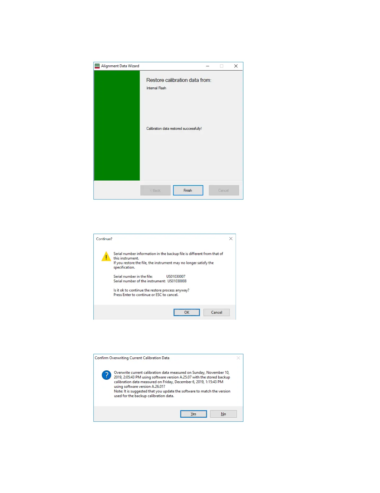 When restoring alignment data, if the serial number information in the backup file