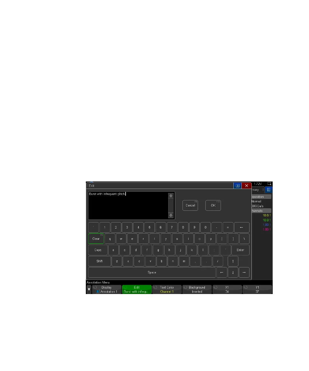 You can add up to four annotations to the oscilloscope's display. Annotations are