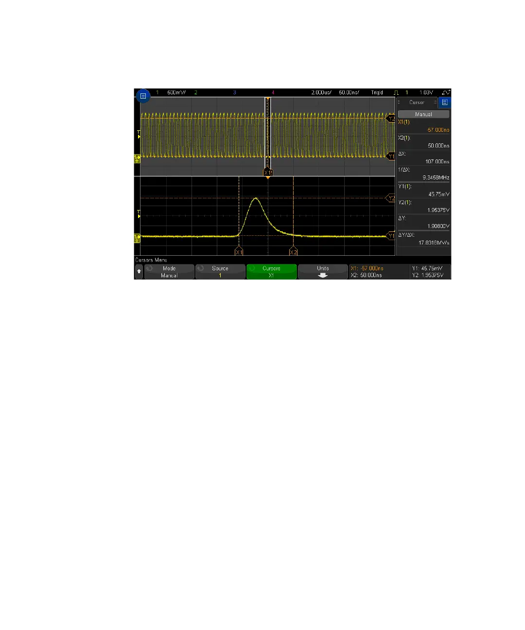 Put the X1 cursor on one side of a pulse and the X2 cursor on the other side of the