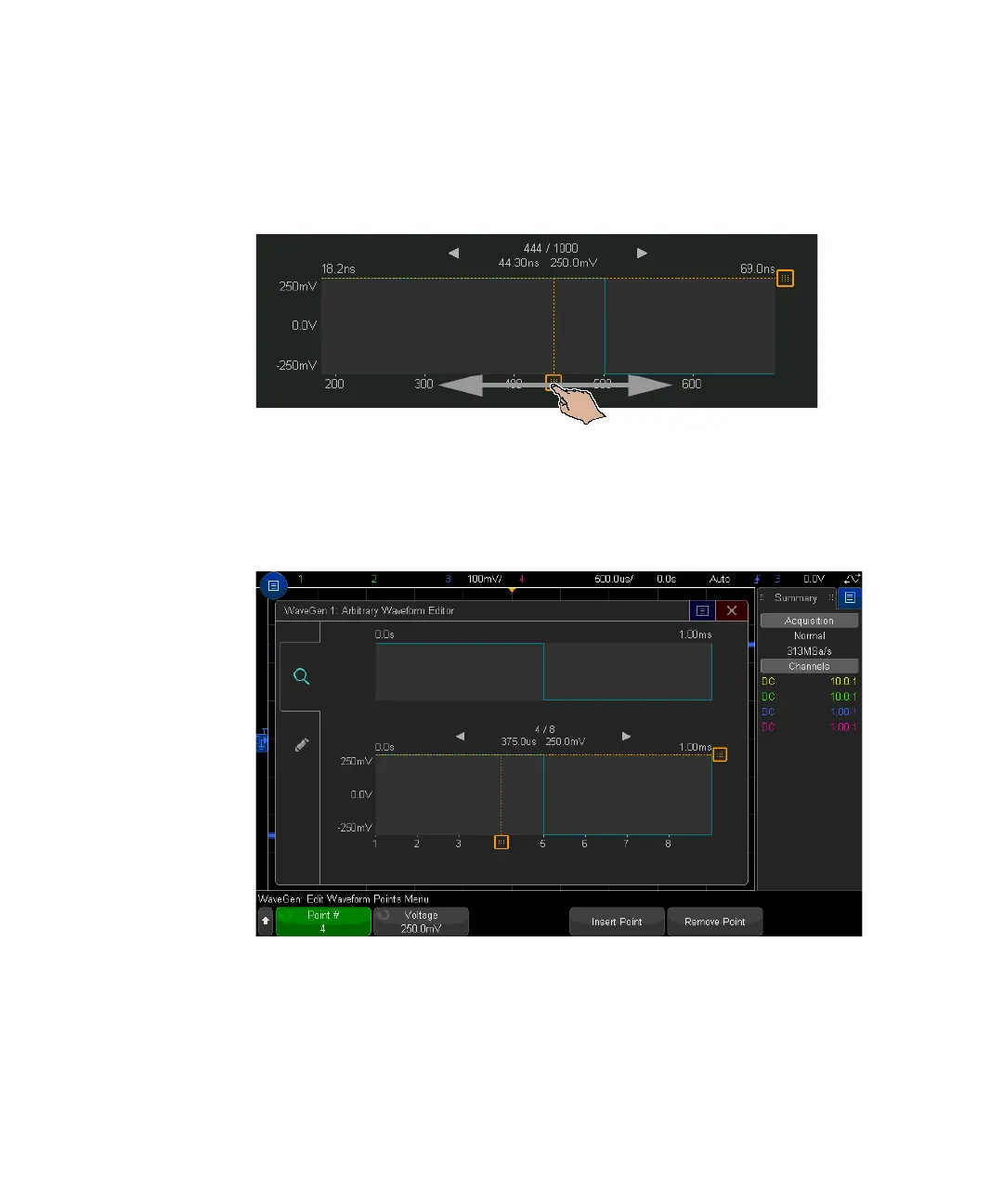 To navigate the arbitrary waveform (and select points), drag the point selection