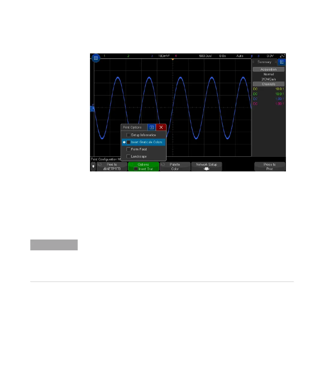 The oscilloscope will print the last menu visited before you pressed the [Print] key. Therefore,