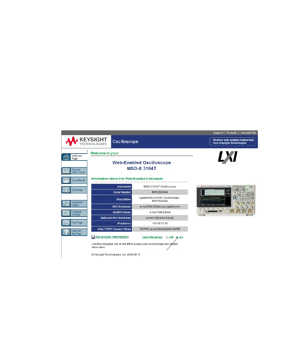 2 When the oscilloscope's web interface Welcome Page is displayed, select the