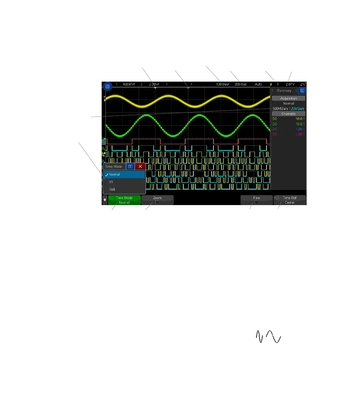 The Horizontal Menu lets you select the time mode (Normal, XY, or Roll), enable