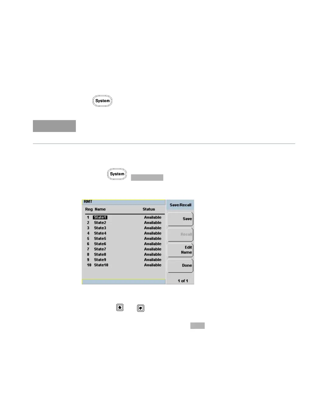 The save/recall functions are part of the Sys/Inputs menu, accessed by pressing