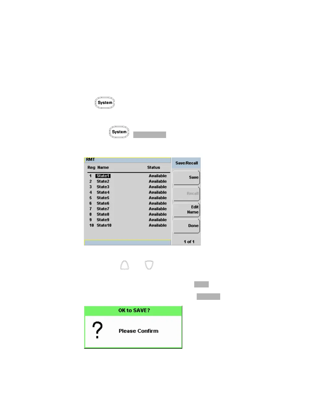 The save/recall functions are part of the Sys/Inputs menu, accessed by pressing