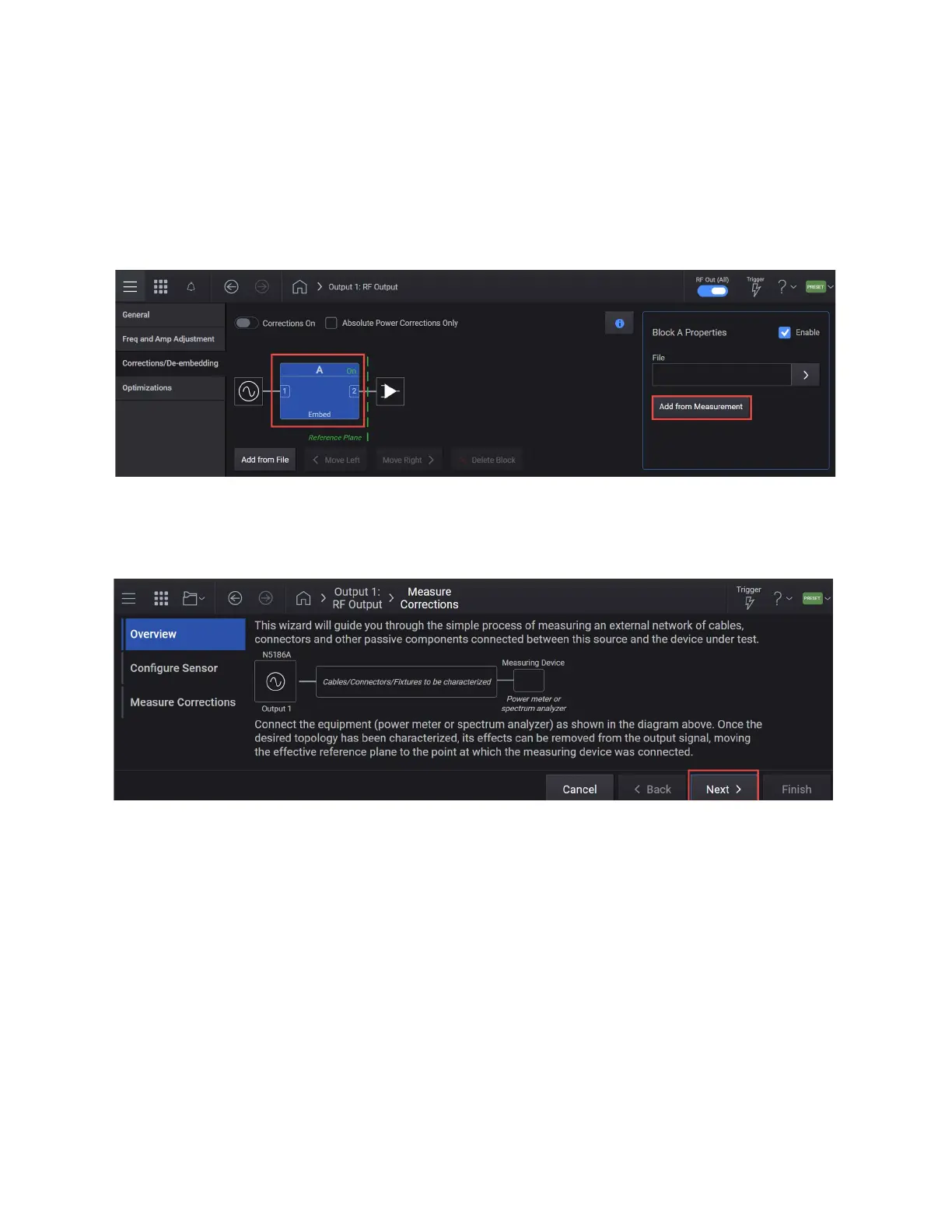 1. Select the RF Output block > Corrections/De-embedding tab to open the