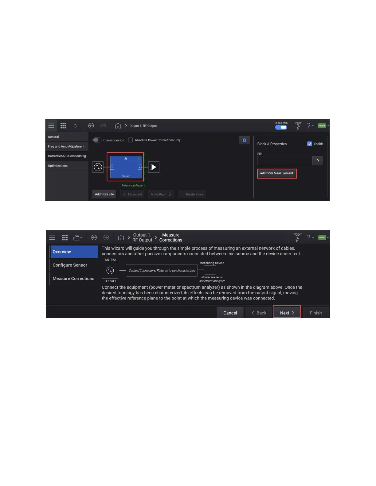 2. Select the RF Output block > Corrections/De-embedding tab to open the