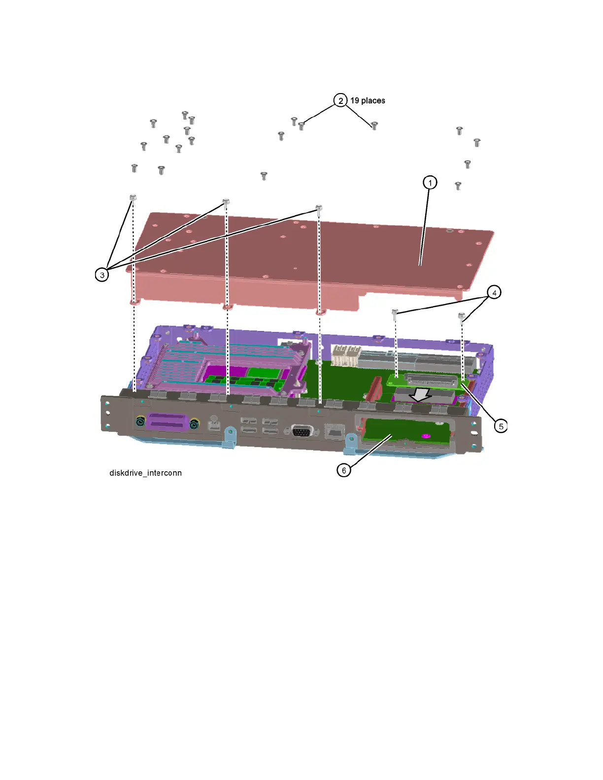 4. Remove the 2 screws (4) that attached the A4A1 Disk Drive Interconnect