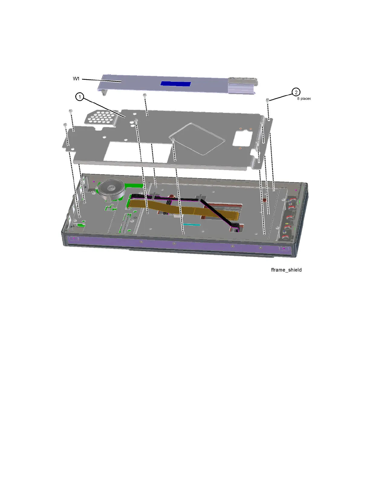 2. To remove the front panel shield (1), remove the eight screws (2)