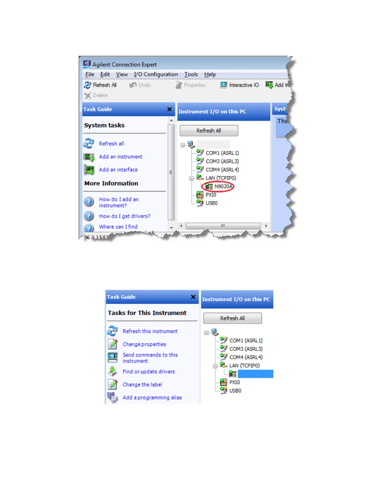 When you click on the N9020A instrument icon in this example, the content of the Task Guide panel on the left changes to