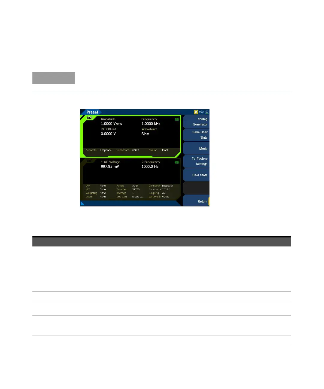 User State Press the User State softkey to reset the U8903B to the previously saved user state.