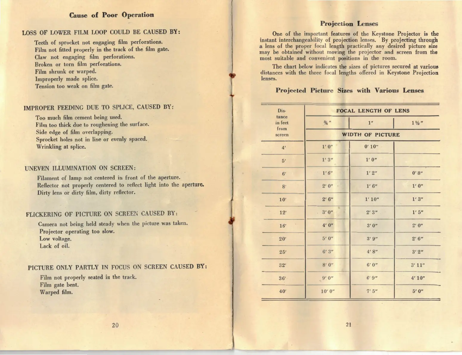 Keystone K-109 - Troubleshooting and Features; Cause of Poor Operation; Projection Lenses