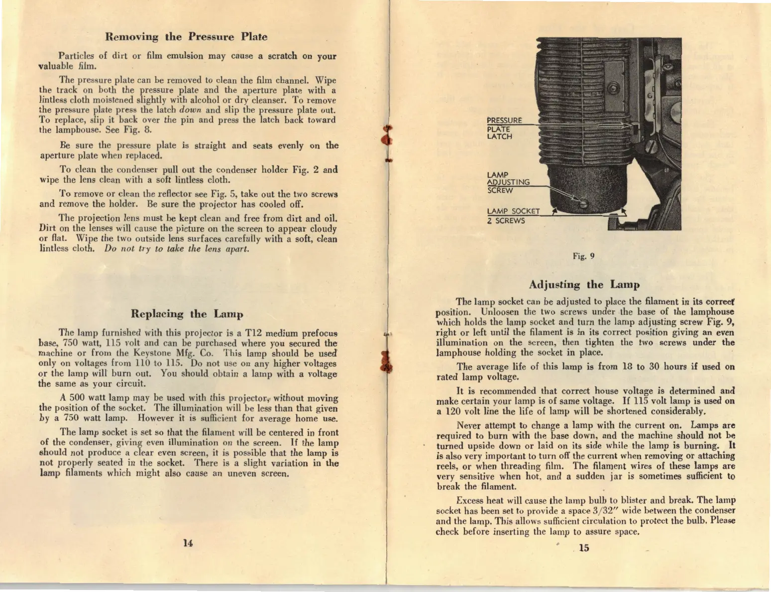 Keystone K-109 - Maintenance and Care; Removing the Pressure Plate; Replacing the Lamp