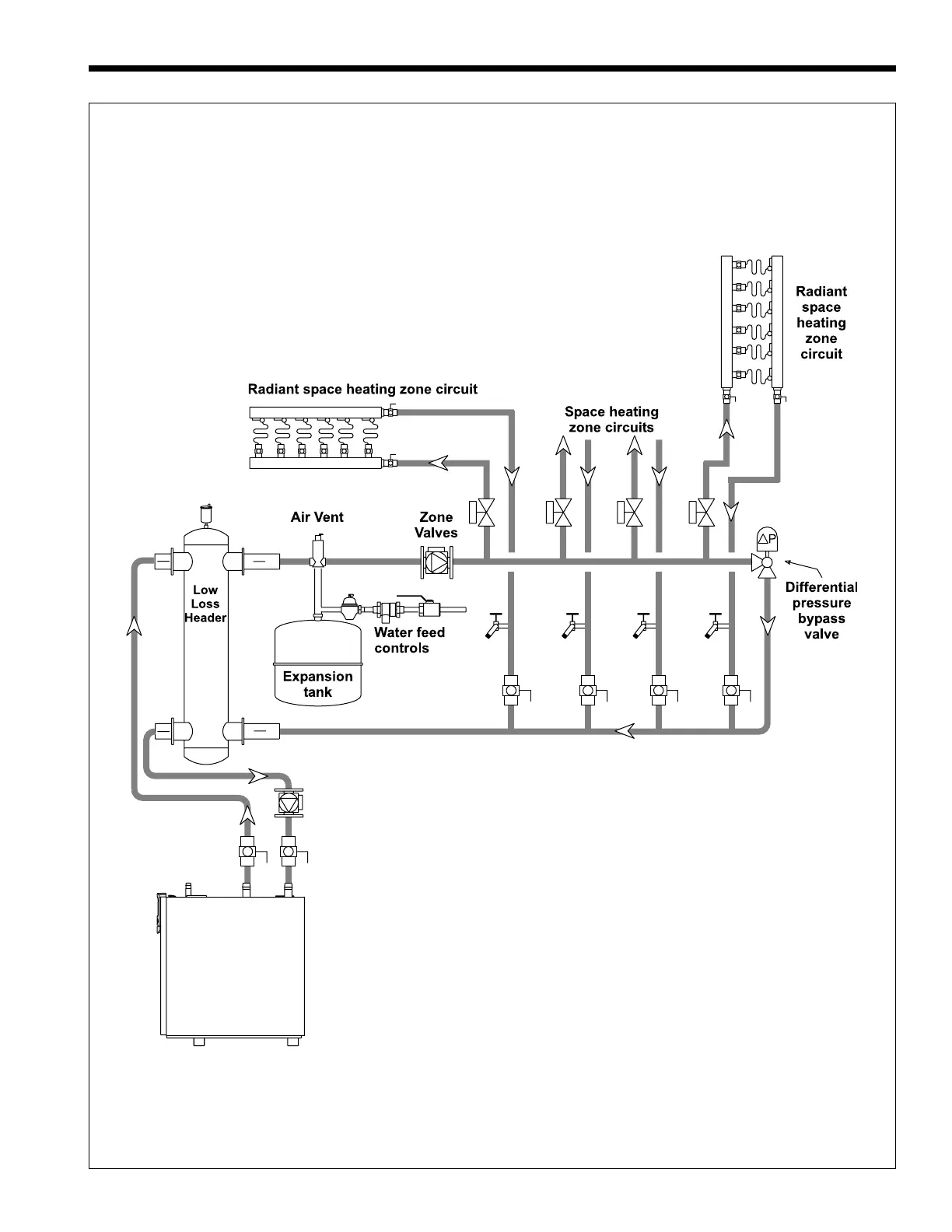 Figure 15. Hydronic Piping — Single Boiler, Low Temp Radiant Space Heating using Low Loss Header and Zone Valves.