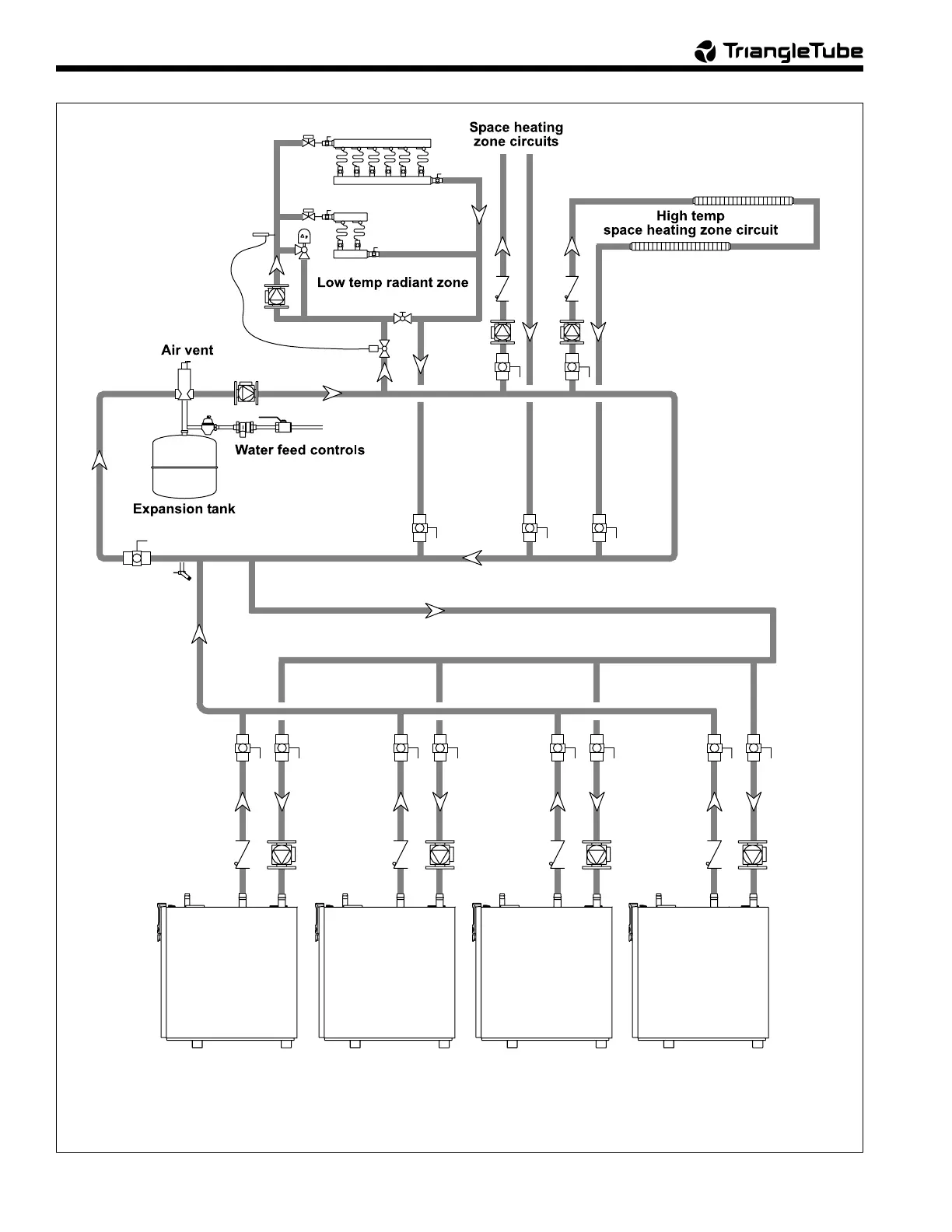 Figure 18. Hydronic Piping — Multiple Boilers, Reverse Return, Multi-Temp Zones (zoning with circulators).