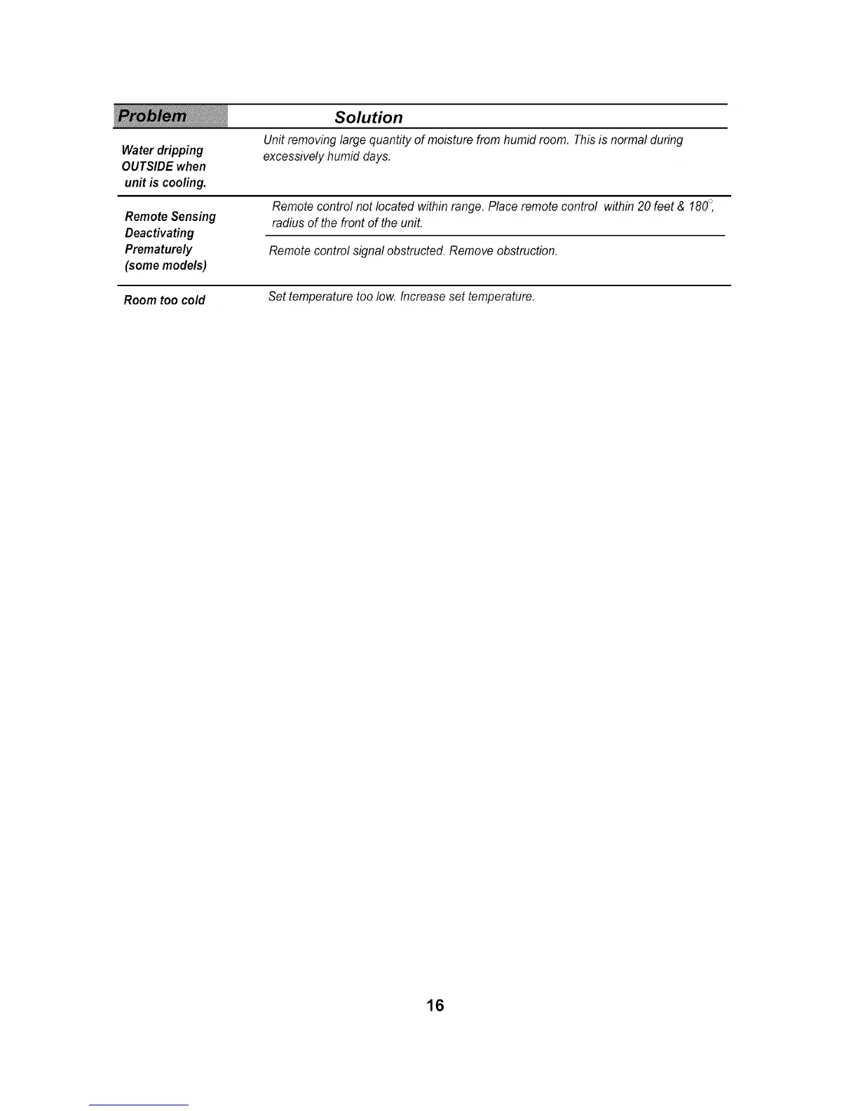 Room too cold Set temperature too low. Increase set temperature.