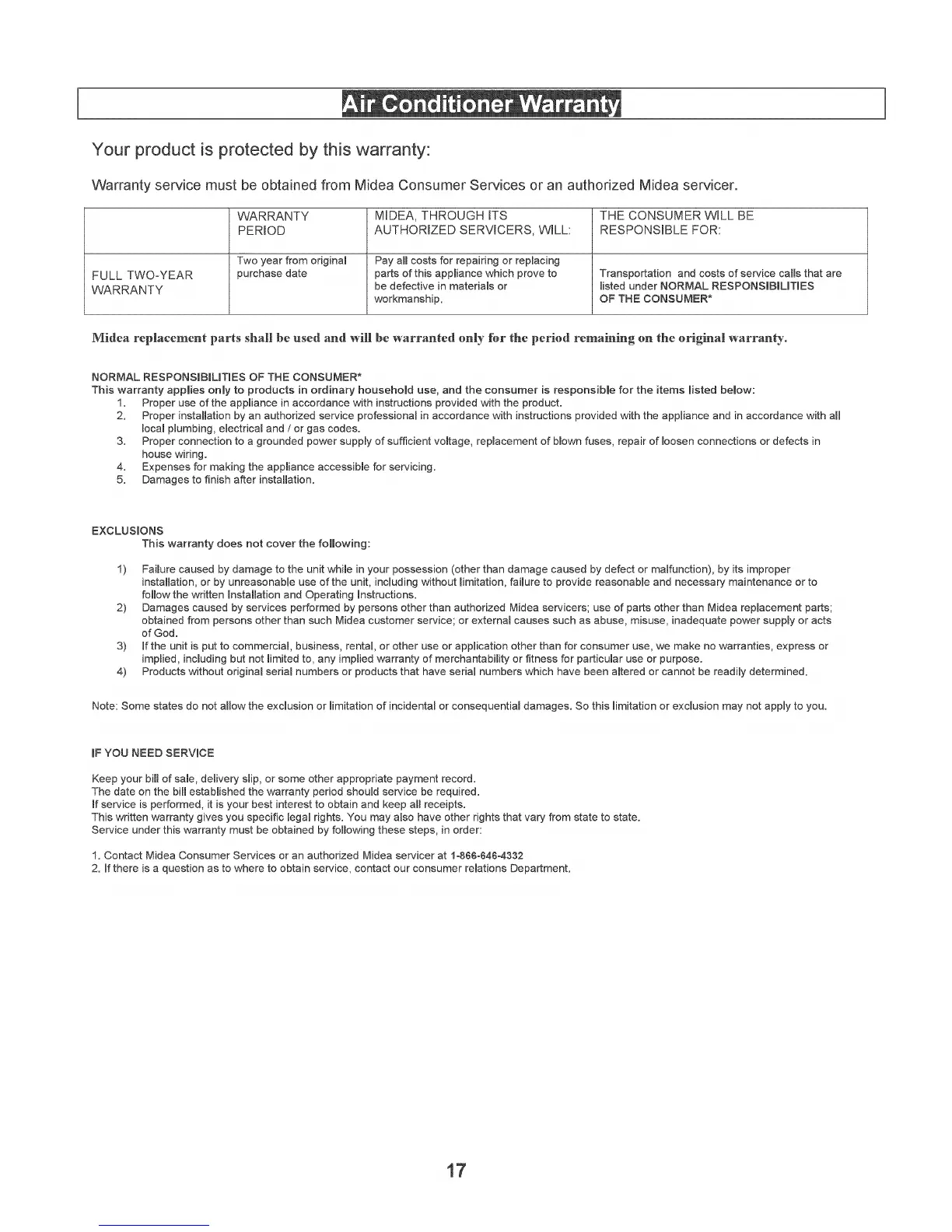 Warranty service must be obtained from Midea Consumer Services or an authorized Midea servicer.
