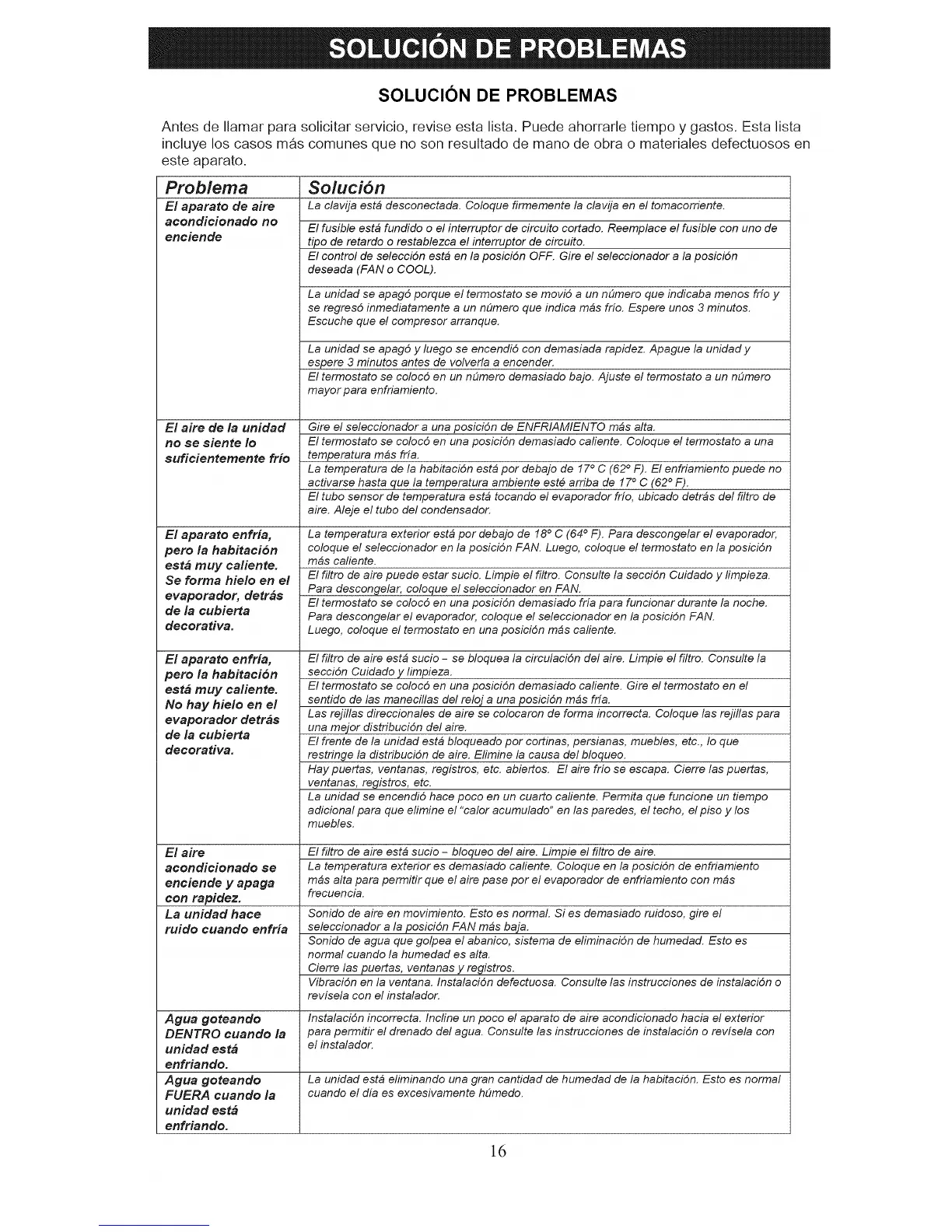 Agua goteando La unidad est_ eliminando una gran cantidad de humedad de la habitaciSn. Esto es normal