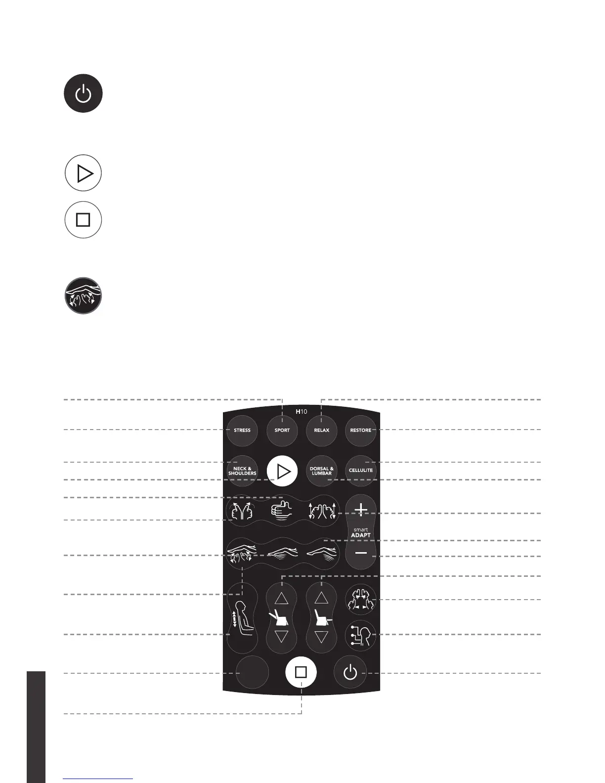 Esta tecla detiene las funciones de masaje del sillón. Los mecanismos internos de masaje