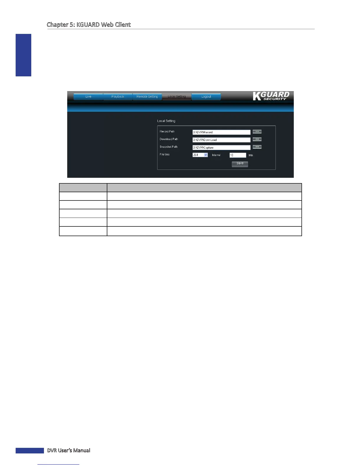 Record Path All manual recording made from the Live screen are saved in this path.