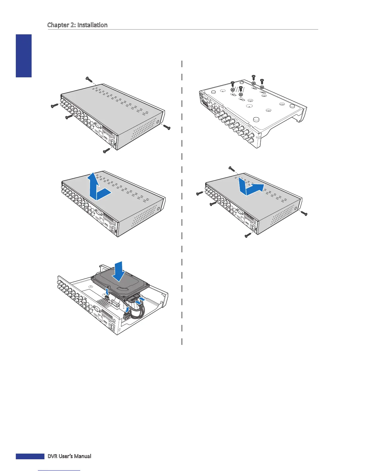 The 16-channel DVR supports supports one 3.5” SATA hard disk drive. To install the HDD, follow the steps below.
