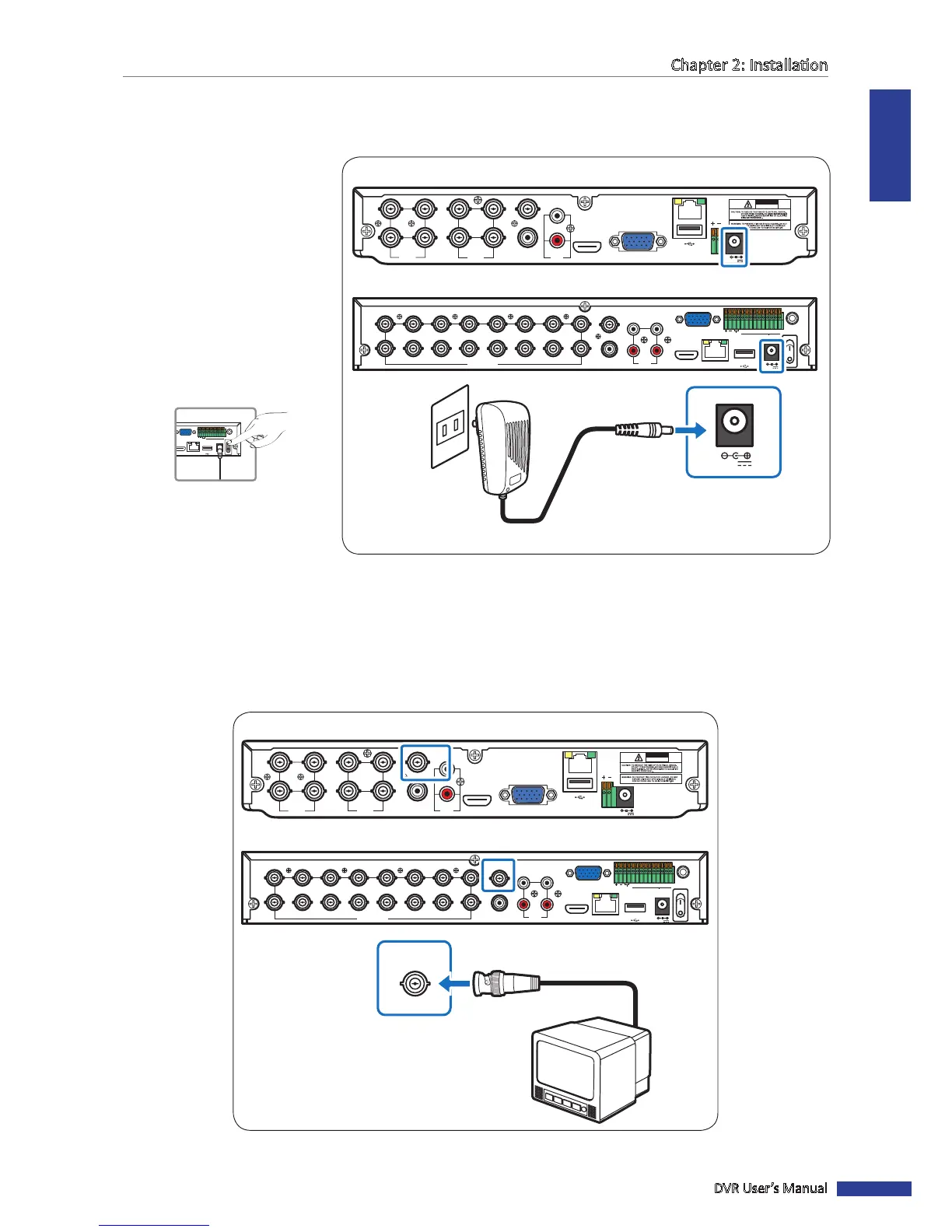 Connect the video output of the DVR to the monitor via BNC connector as shown.